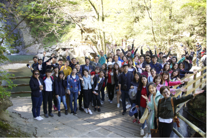 来自全国45家交通广播的70多名记者在九影瀑前合影留念